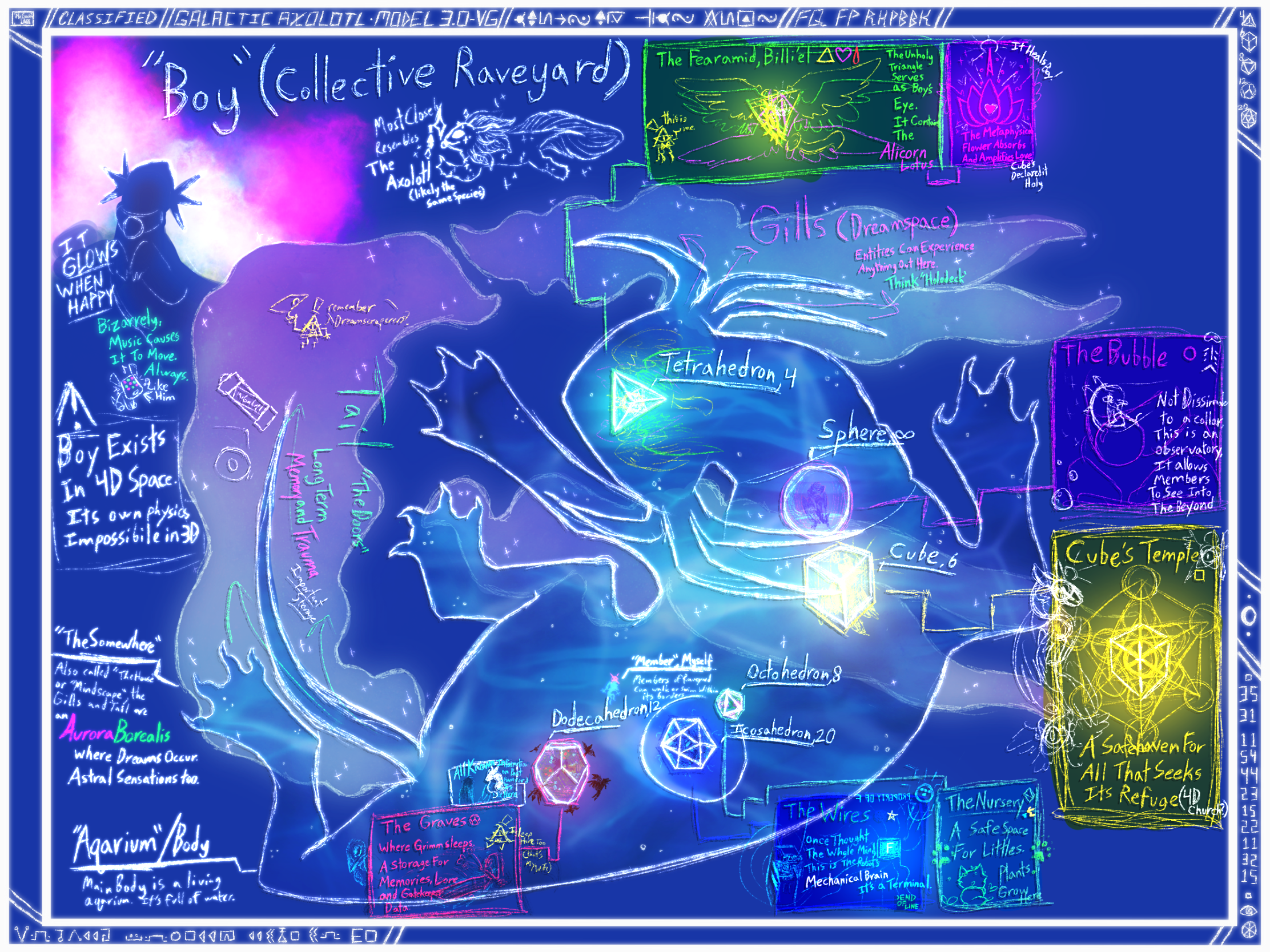 Boy is a Cosmic that takes the form of a living spaceship and/or aquarium in the shape of a giant axolotl. Its body is transparent and appears to be full of water, though said water is perfectly breathable to the beings that live within its skin. The Platonic Solids float around inside of its body, homes belonging to their designated alters. These shapes are in fact massive structures, as will be explained on their applicable pages. Its gills and tail are a pink and green aurora borealus that is in fact the raveyard's dreams and memories. These glow brightly among the cosmos when Boy is happy- most often when it can hear music. Boy can appear in "Lesser Forms", to the whims of whatever alter feels like drawing it at any time. It is often depicted with eyelashes and a tounge- neither of which real axolotls have or need, since axolotls are aquatic salamanders.