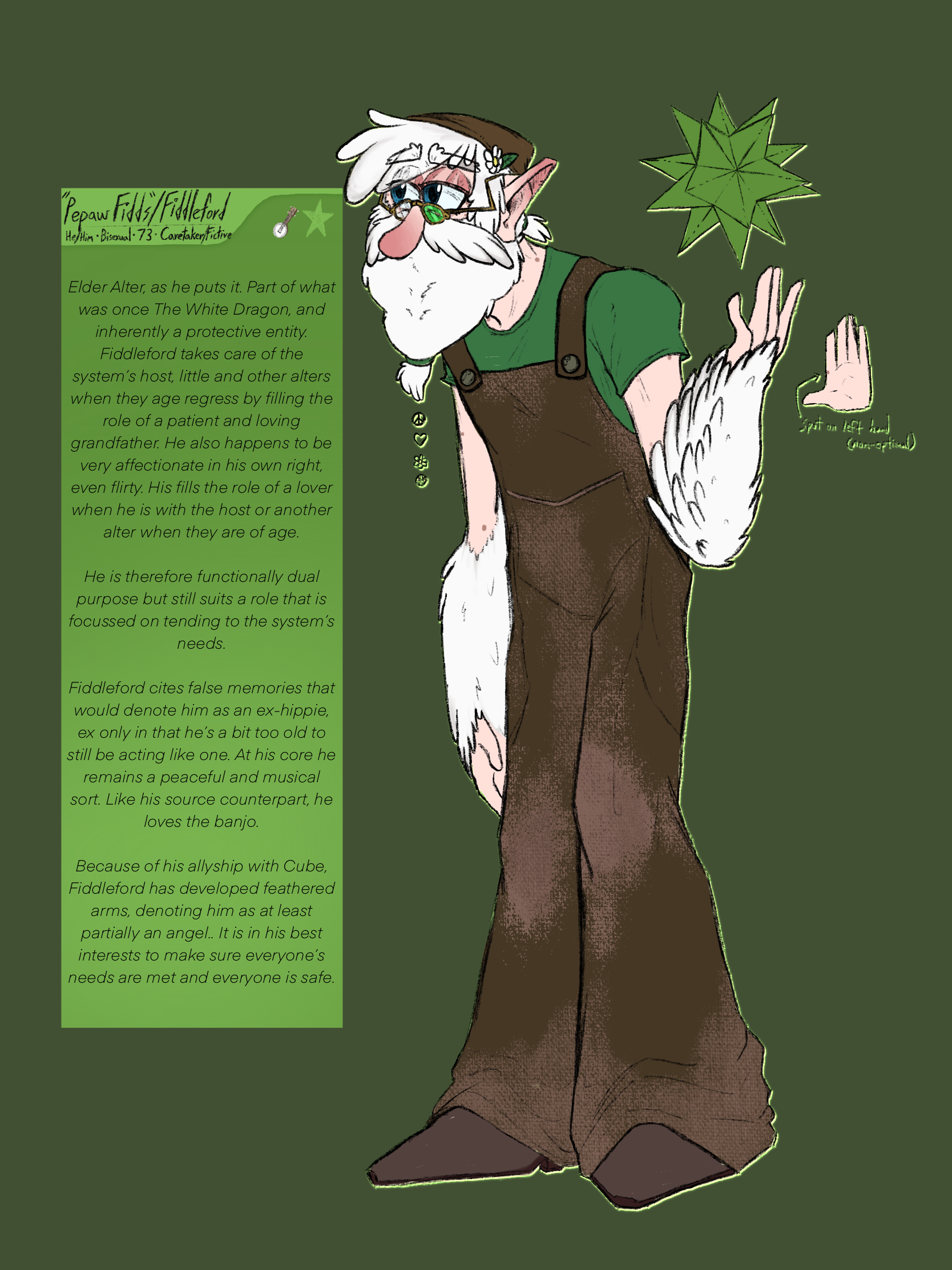 Description: Fidds is very much so Poly's other half- keeping it stable and happy to the best of his ability. Fidds has the innate ability to get whoever he is sharing cofront with to age regress. He preforms a very grandfather-like role- comforting his "little ones" and getting them through thick and thin. He himself is very handy when it comes to getting tasks done as he is determined. Somehow, this fails to deter his overactive libido. We won't get into detail, but it's worth making note of. Fidds is, by all means, a hypersexual being.